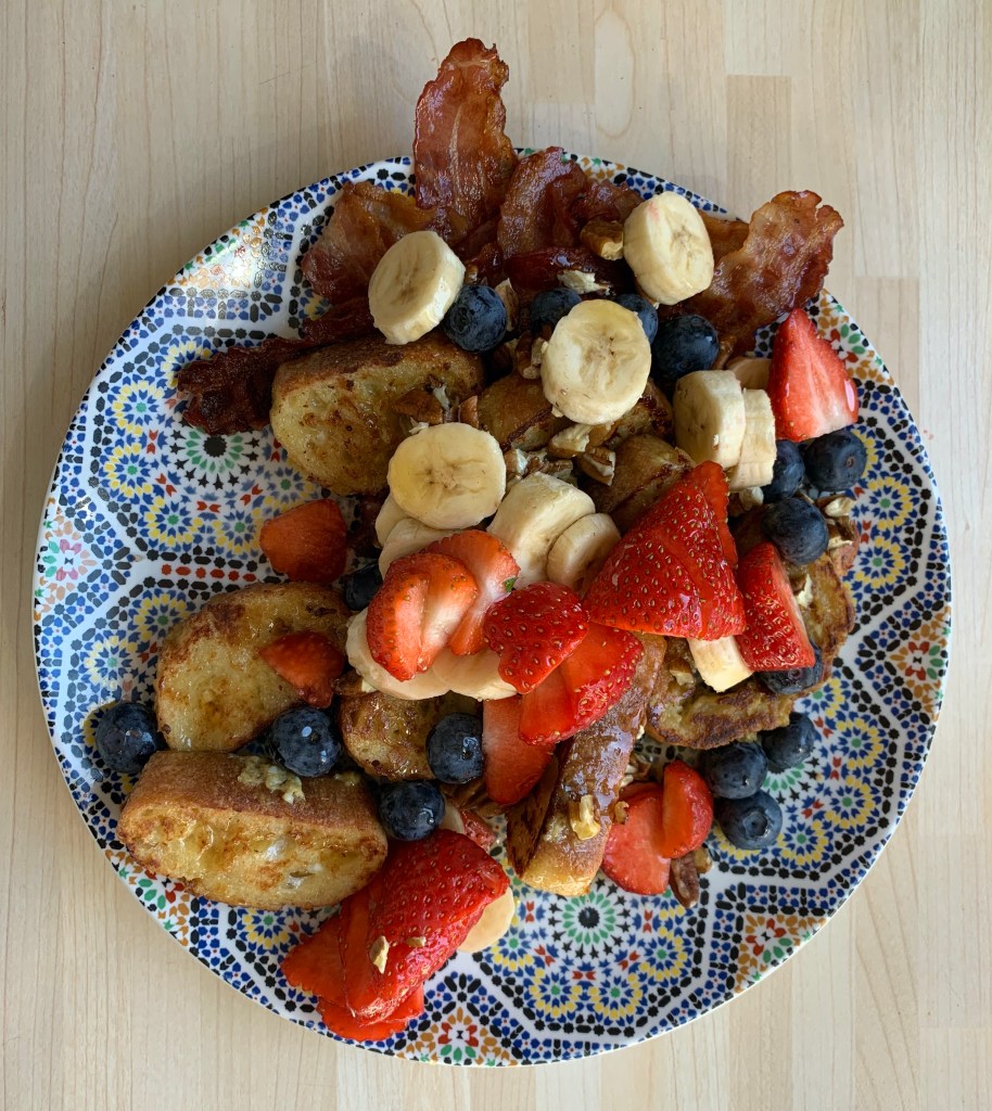Once plated I recommend cutting each slice in half and dipping the bread directly into the bowl of goat cheese dip. I like to add fruit such as raspberries, blueberries, strawberries, or bananas. For some added crunch I also add pecan and walnut pieces. Finish it all off with some maple syrup and a side of bacon. You’re worth it.